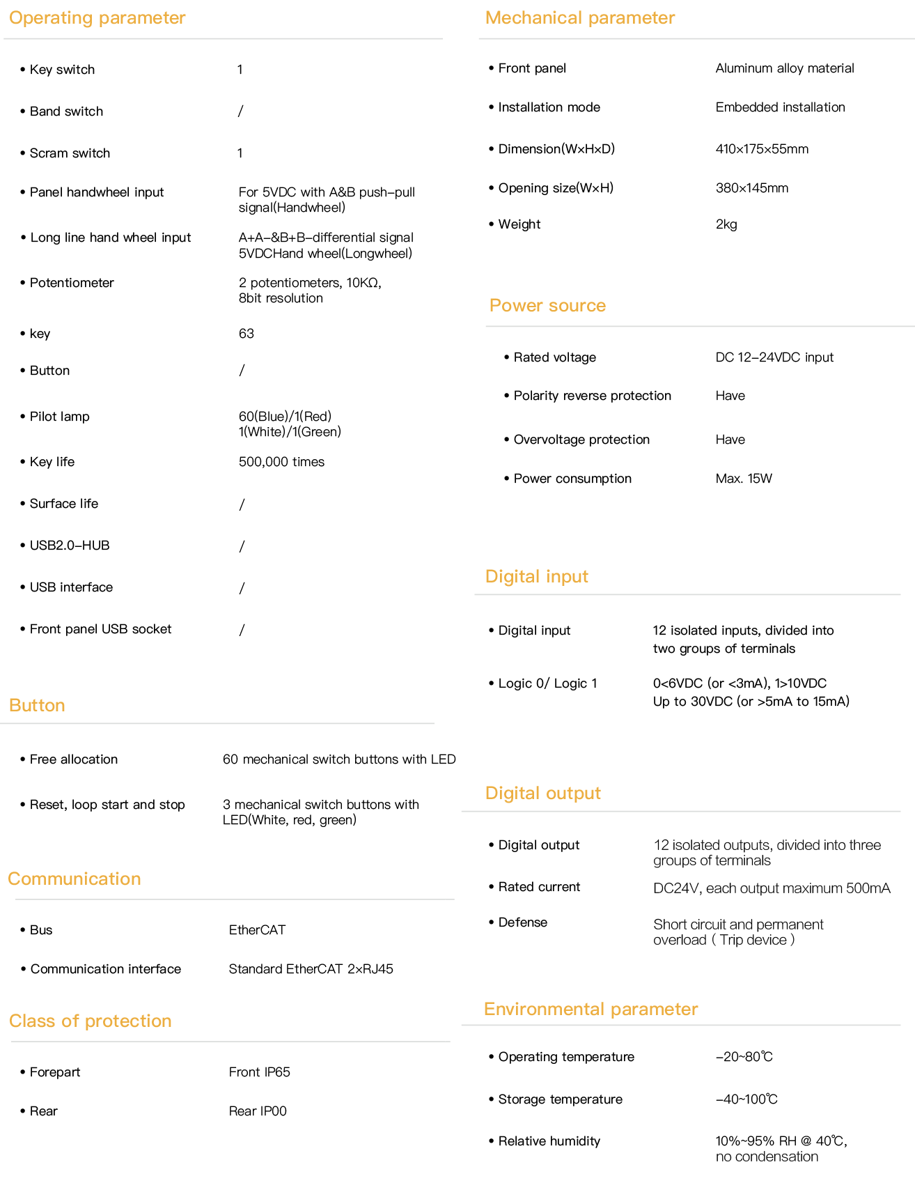 EC-8105 is an EtherCAT industrial bus operation panel. It is applicable to CNC numerical control systems and can achieve precise and reliable human-machine interaction. It is equipped with 63 operation keys, 63 status indicator lights, 2 pulse handwheel interfaces (1 differential and 1 single-ended), 2 256-range potentiometers, 21 range band selection switches for range setting, 1 three-range key switch, 12 isolated GPO and 12 isolated GPI, as well as an independent emergency stop switch. Default DC 24V input (dual main and backup channels). The whole machine adopts an anti-interference design, which can effectively resist the interference of high-power motors, servo systems, etc. in industrial sites, providing a good operating experience.