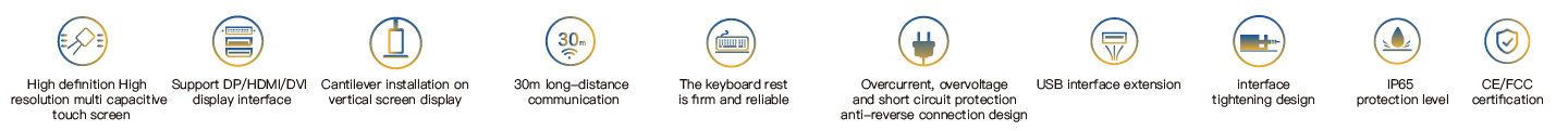 The PDS-6721 is an industrial touch panel with an upper cantilever installation. It features vertical screen display and is equipped with a keyboard stand. It is configured with a 21.5 "high-definition LCD screen with a resolution of 1920*1080 and a projected multi-touch capacitive screen. It supports three signal transmission interfaces: HDMI, DVI and DP, as well as multiple USB2.0 interface expansions. The maximum communication distance between the PC and the touch panel can reach 30 meters. The whole machine is powered by DC24V and the front panel has an IP65 protection level. All interfaces adopt a fastened design and have passed CE/FCC certification, making them suitable for demanding human-machine interaction industrial sites.