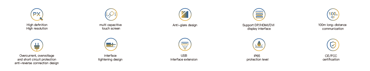 SPD-1500E is an embedded ultra-thin industrial touch panel. It is equipped with a 15.6-inch high-definition LCD screen with a resolution of 1920×1080 and a projected multi-point capacitive touch screen. It supports three signal transmission interfaces: HDMI, DVI and DP, as well as multiple USB interface expansions. The maximum communication distance between the PC and the touch panel can reach 15 meters, and the entire machine is powered by DC24V. The front panel has an IP65 protection rating. All interfaces are designed with fastening and have passed CE/FCC certification, making it suitable for demanding human-machine interaction industrial sites.