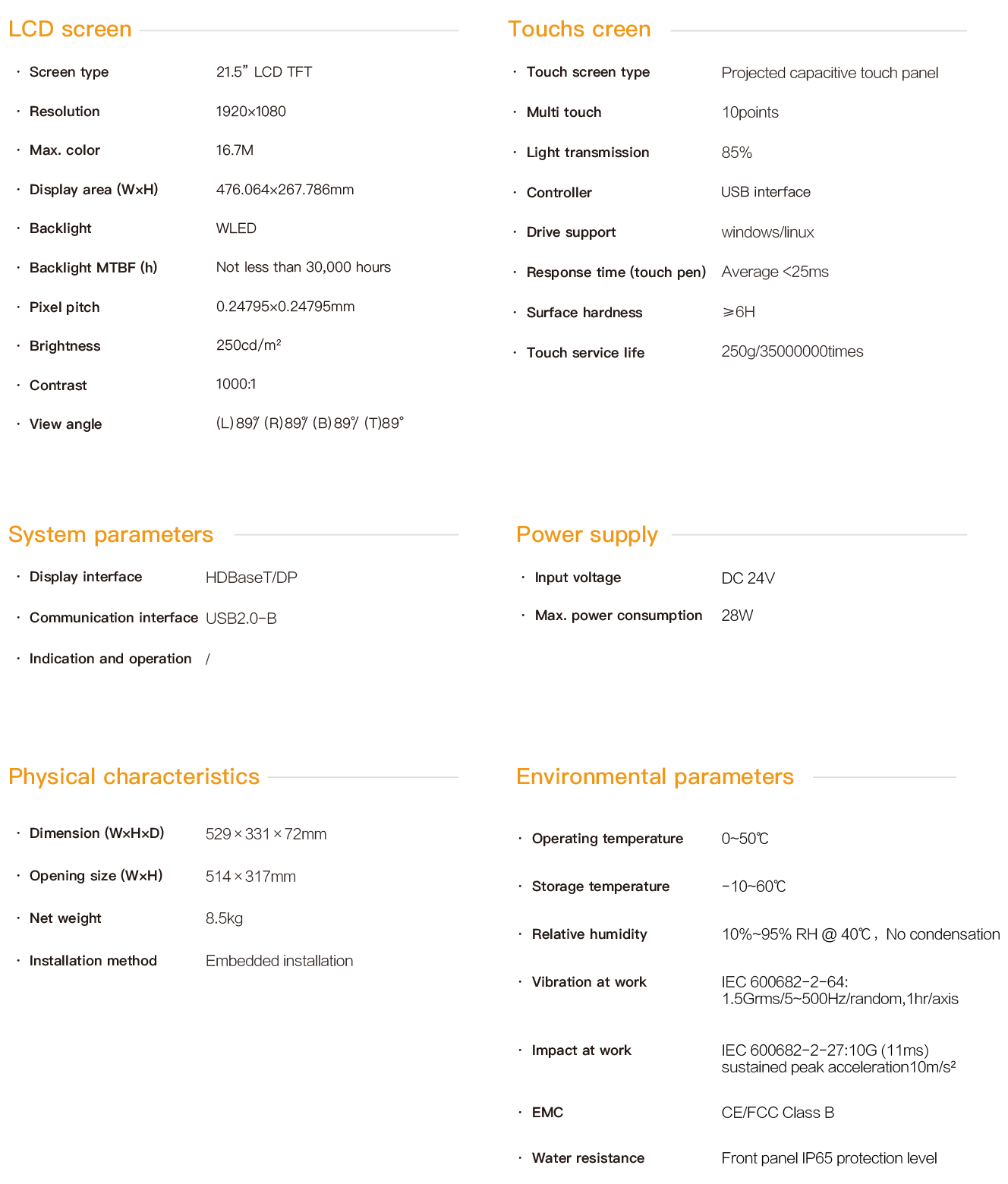 SPD-2200E is an embedded ultra-thin industrial touch panel. It is equipped with a 21.5-inch high-definition LCD screen with a resolution of 1920×1080 and a projected multi-point capacitive touch screen. Supports HDBaseT and DP signal transmission interfaces, with multiple USB interface expanders. The maximum communication distance between the PC and the touch panel can reach 100 meters, and the entire machine is powered by DC24V. The front panel has an IP65 protection rating. All interfaces are designed with fastening and have passed CE/FCC certification, making it suitable for demanding human-machine interaction industrial sites.