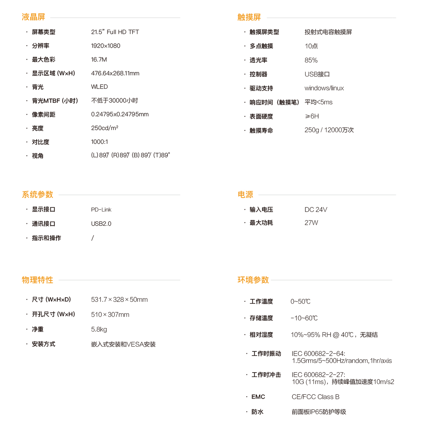 PD-8621是一種高性能工業(yè)遠(yuǎn)傳觸控顯示面板,配備21.5”,分辨率為1920x1080的高清液晶顯示屏,支持PD-Link顯示接口;觸控屏幕采用多點(diǎn)投射式電容觸摸屏,。顯示與觸摸部分有特殊抗干擾設(shè)計(jì),可有效抵抗工業(yè)現(xiàn)場(chǎng)大功率電機(jī)、伺服等干擾,保證良好的顯示效果與觸控體驗(yàn),適應(yīng)各種電磁環(huán)境復(fù)雜的工業(yè)現(xiàn)場(chǎng)。