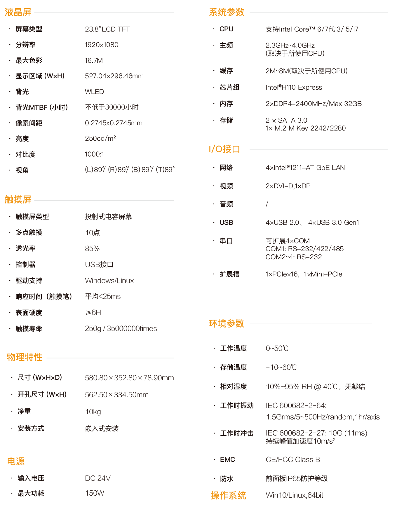 HPC-9623是一款工業(yè)型電容觸控平板電腦,將工業(yè)顯示和觸摸屏技術(shù)相結(jié)合,產(chǎn)品結(jié)構(gòu)緊湊、易于安裝、操控方便,是一款高效能、高可靠的工業(yè)電腦系統(tǒng),整機(jī)采用23.8寸分辨率為1920*1080的高清液晶顯示屏,色彩豐富細(xì)膩,視角寬闊,24V直流供電,采用投射式10點(diǎn)電容屏,主機(jī)部分搭載Intel Core 6/7代CPU,可配置大容量固態(tài)SSD,內(nèi)存支持最大32G容量。 HPC-9623支持掛鉤式嵌入式安裝,前面板符合IP65防水防塵標(biāo)準(zhǔn),杜絕安裝在控制柜時(shí)因現(xiàn)場(chǎng)飛濺的水滴進(jìn)入,高強(qiáng)度全鋼型箱體結(jié)構(gòu),具有抗沖擊和振動(dòng)防護(hù)功能,尤其是專門(mén)的EMC設(shè)計(jì)使得整機(jī)具有優(yōu)秀的抗干擾能力,能夠適應(yīng)工業(yè)現(xiàn)場(chǎng)惡劣的工作環(huán)境,廣泛應(yīng)用于工廠自動(dòng)化、機(jī)械制造、數(shù)控設(shè)備、紡織設(shè)備、通訊網(wǎng)絡(luò)以及電力自動(dòng)化等強(qiáng)干擾的工業(yè)現(xiàn)場(chǎng)。