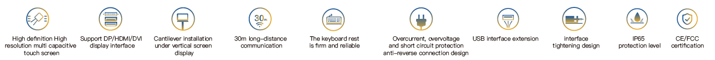 The PDX-3621 is an industrial touch panel with a lower cantilever installation. It features horizontal screen display and is equipped with a keyboard stand. It is configured with a 21.5 "high-definition LCD screen with a resolution of 1920x1080 and a projected multi-touch capacitive screen. It supports three signal transmission interfaces: HDMI, DVI and DP, as well as multiple USB2.0 interface expansions. The maximum communication distance between the PC and the touch panel can reach 30 meters, and the entire machine is powered by DC24V. The front panel has an IP65 protection rating. All interfaces are designed with fastening and have passed CE/FCC certification, making it suitable for demanding human-machine interaction industrial sites.