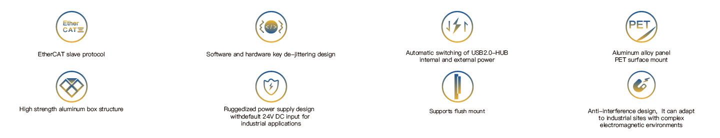 EC-8105 is an EtherCAT industrial bus operation panel. It is applicable to CNC numerical control systems and can achieve precise and reliable human-machine interaction. It is equipped with 63 operation keys, 63 status indicator lights, 2 pulse handwheel interfaces (1 differential and 1 single-ended), 2 256-range potentiometers, 21 range band selection switches for range setting, 1 three-range key switch, 12 isolated GPO and 12 isolated GPI, as well as an independent emergency stop switch. Default DC 24V input (dual main and backup channels). The whole machine adopts an anti-interference design, which can effectively resist the interference of high-power motors, servo systems, etc. in industrial sites, providing a good operating experience.