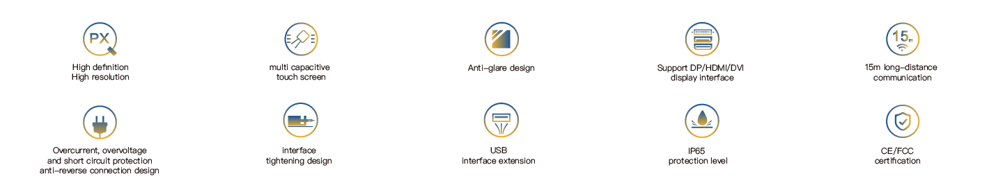 SPD-1500 is an embedded ultra-thin industrial touch panel. It is equipped with a 15.6-inch high-definition LCD screen with a resolution of 1920×1080 and a projected multi-point capacitive touch screen. It supports three signal transmission interfaces: HDMI, DVI and DP, as well as multiple USB interface expansions. The maximum communication distance between the PC and the touch panel can reach 15 meters, and the entire machine is powered by DC24V. The front panel has an IP65 protection rating. All interfaces are designed with fastening and have passed CE/FCC certification, making it suitable for demanding human-machine interaction industrial sites.