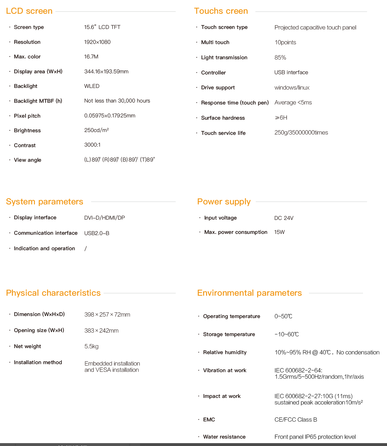 SPD-1500E is an embedded ultra-thin industrial touch panel. It is equipped with a 15.6-inch high-definition LCD screen with a resolution of 1920×1080 and a projected multi-point capacitive touch screen. It supports three signal transmission interfaces: HDMI, DVI and DP, as well as multiple USB interface expansions. The maximum communication distance between the PC and the touch panel can reach 15 meters, and the entire machine is powered by DC24V. The front panel has an IP65 protection rating. All interfaces are designed with fastening and have passed CE/FCC certification, making it suitable for demanding human-machine interaction industrial sites.
