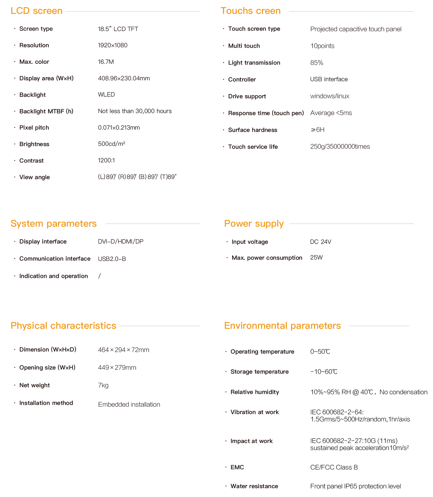 SPD-1900E is an embedded ultra-thin industrial touch panel. It is equipped with an 18.5-inch high-definition LCD screen with a resolution of 1920×1080 and a projected multi-point capacitive touch screen. Supports HDBaseT and DP signal transmission interfaces, with multiple USB interface expanders. The maximum communication distance between the PC and the touch panel can reach 100 meters, and the entire machine is powered by DC24V. The front panel has an IP65 protection rating. All interfaces are designed with fastening and have passed CE/FCC certification, making it suitable for demanding human-machine interaction industrial sites.