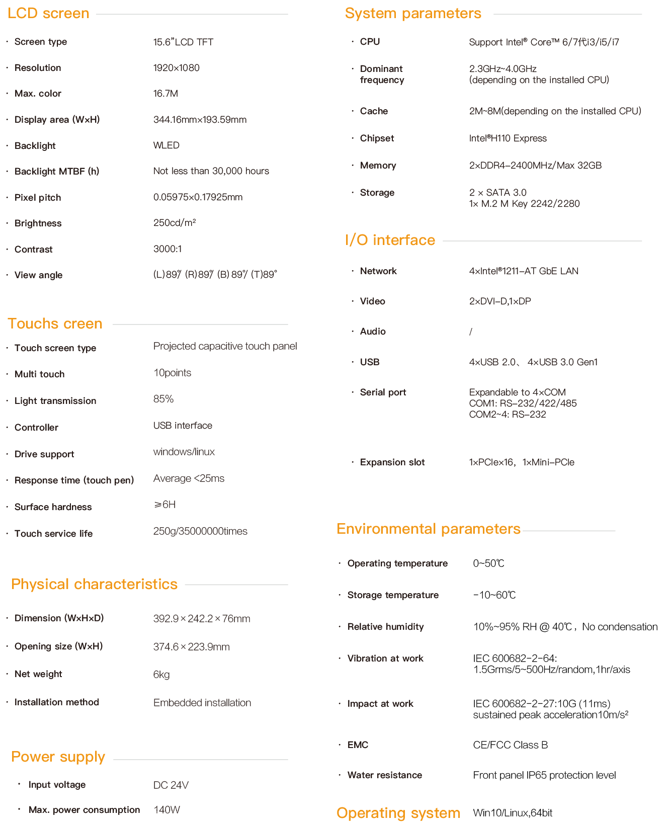 The HPC-9615 is an industrial capacitive touch tablet computer. Combine industrial display and touchscreen technology. The product has a compact structure, is easy to install and operate, and is a high-performance and highly reliable industrial computer system. The whole machine adopts a 15.6-inch high-definition LCD screen with a resolution of 1920*1080, featuring rich and delicate colors and a wide viewing Angle. It is powered by 24V DC and adopts a projected 10-point capacitive screen. The main unit is equipped with Intel Core 6th / 7th generation cpus, and can be configured with large-capacity solid-state SSDS. The memory supports a maximum capacity of 32G. The HPC-9615 supports hook-type embedded installation. The front panel complies with the IP65 water and dust resistance standard, preventing water splashes from entering during installation in the control cabinet. The high-strength all-steel box structure features shock resistance and vibration protection functions. Especially, the specialized EMC design enables the entire machine to have excellent anti-interference ability and be able to adapt to the harsh working environment in industrial sites. It is widely applied in industrial sites with strong interference such as factory automation, mechanical manufacturing, numerical control equipment, textile equipment, communication networks and power automation.