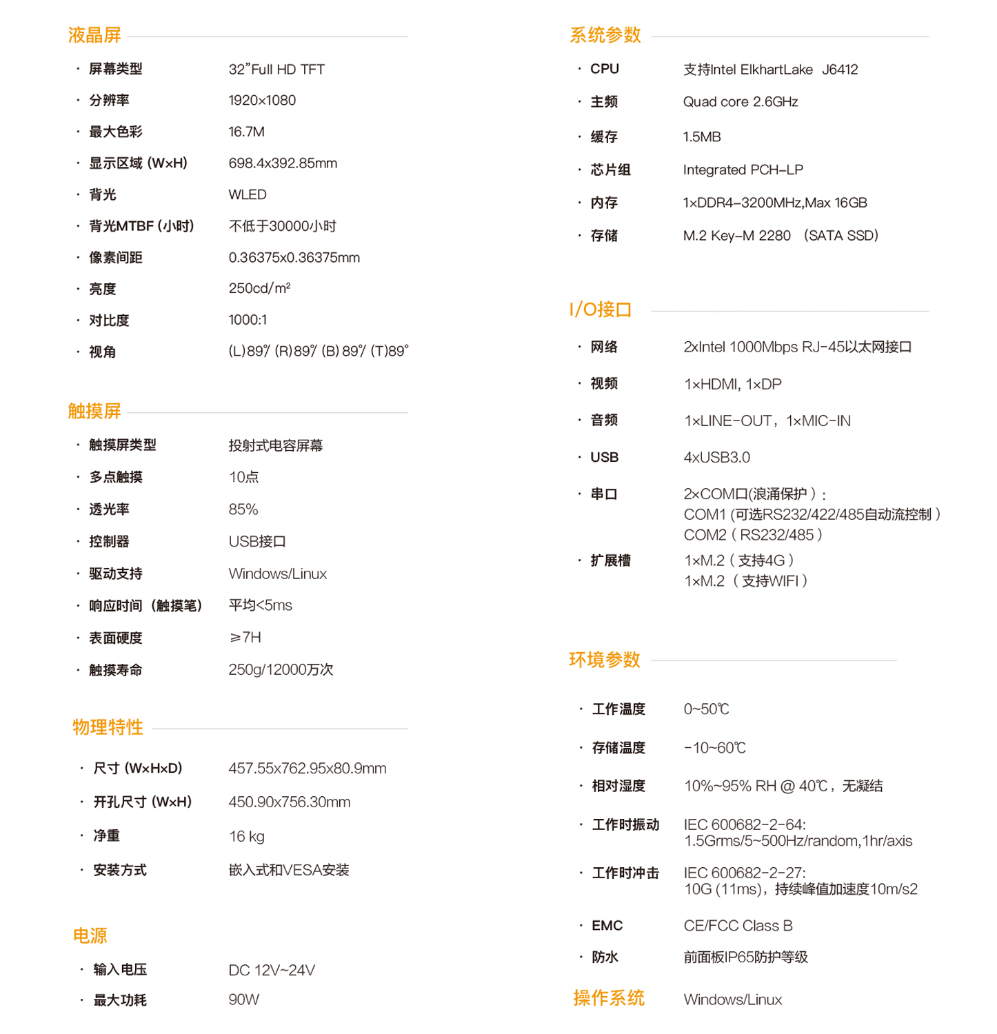 TPC-5632是一款嵌入式工業(yè)型電容觸控平板電腦,采用無風(fēng)扇靜音設(shè)計(jì),產(chǎn)品構(gòu)成緊湊、易于安裝、操控方便。整機(jī)采用32”分辨率為1920x1080的高清液晶顯示屏,觸控采用多點(diǎn)投射式電容屏。主機(jī)部分基于Intel ElkhartLake處理平臺CPU,采用J6412處理器。支持多種安裝方式,專門的EMC設(shè)計(jì)使得機(jī)器能夠適應(yīng)工業(yè)現(xiàn)場惡劣的工作環(huán)境,廣泛應(yīng)用于各種強(qiáng)干擾工業(yè)場合。