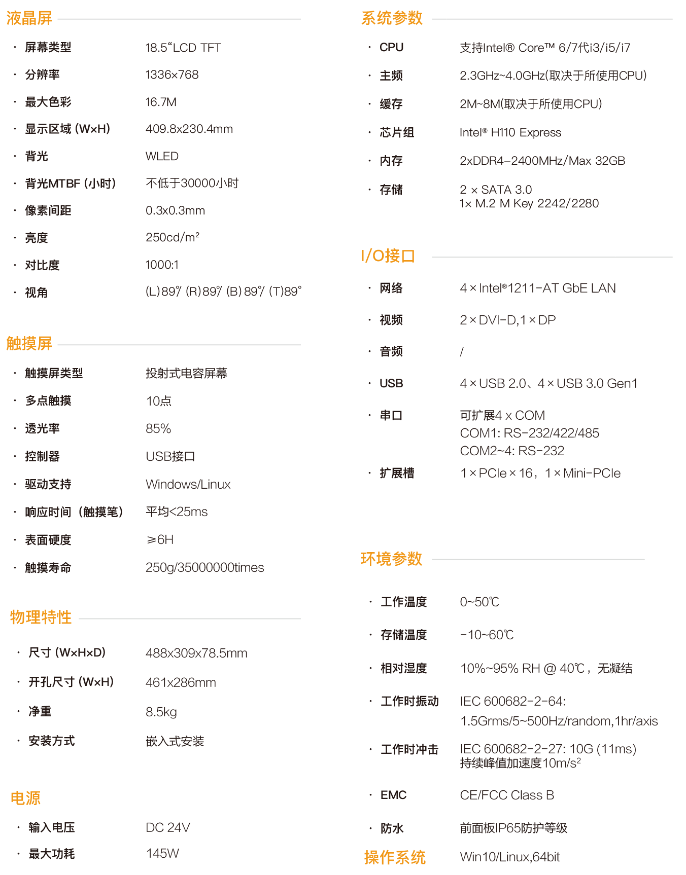NPC-184i是一款工業(yè)型電容觸控平板電腦,將工業(yè)顯示和觸摸屏技術(shù)相結(jié)合,產(chǎn)品結(jié)構(gòu)緊湊、易于安裝、操控方便,是一款高效能、高可靠的工業(yè)電腦系統(tǒng),整機采用18.5寸分辨率為1366×768的高清液晶顯示屏,色彩豐富細膩,視角寬闊,24V直流供電,采用投射式10點電容屏,主機部分搭載Intel Core 6/7代CPU,可配置大容量固態(tài)SSD,內(nèi)存支持最大32G容量。 NPC-184i支持掛鉤式嵌入式安裝,前面板符合IP65防水防塵標準,杜絕安裝在控制柜時因現(xiàn)場飛濺的水滴進入,高強度全鋼型箱體結(jié)構(gòu),具有抗沖擊和振動防護功能,尤其是專門的EMC設(shè)計使得整機具有優(yōu)秀的抗干擾能力,能夠適應(yīng)工業(yè)現(xiàn)場惡劣的工作環(huán)境,廣泛應(yīng)用于工廠自動化、機械制造、數(shù)控設(shè)備、紡織設(shè)備、通訊網(wǎng)絡(luò)以及電力自動化等強干擾的工業(yè)現(xiàn)場。